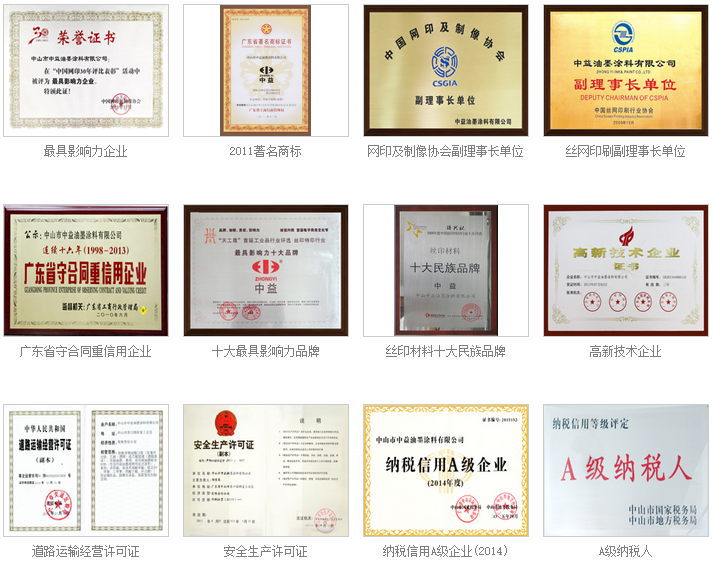 1999年,中山市人民政府授予我司“重合同守信用企业”,并连续十二年获此殊荣;中益公司成为中国丝网印刷行业协会常务理事单位。