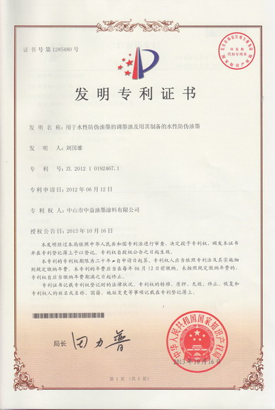 以下是近年来,中益油墨申请到的发明专利证书: