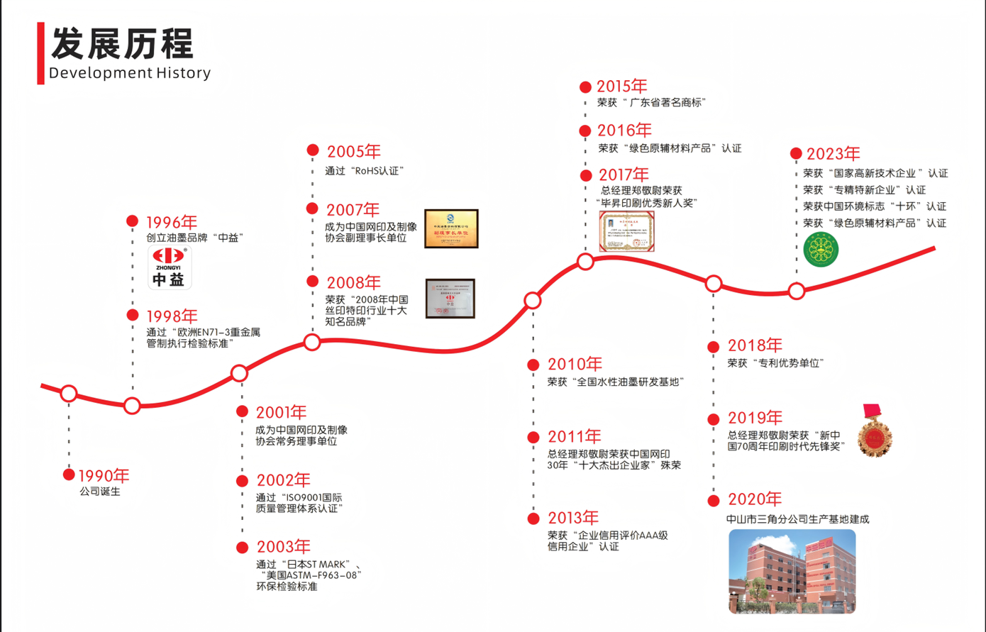 自1990年开始涉足丝网印刷行业,历经20年的发展。“中益”品牌油墨已成为行业中的佼佼者,各类高品质丝印、移印、喷涂、UV型油墨及环保水性油墨、印花胶浆、印刷辅材、制版材料等产品与服务遍及全国和东南亚各国市场,为促进中国丝网印刷行业的快速发展做出了突出贡献。