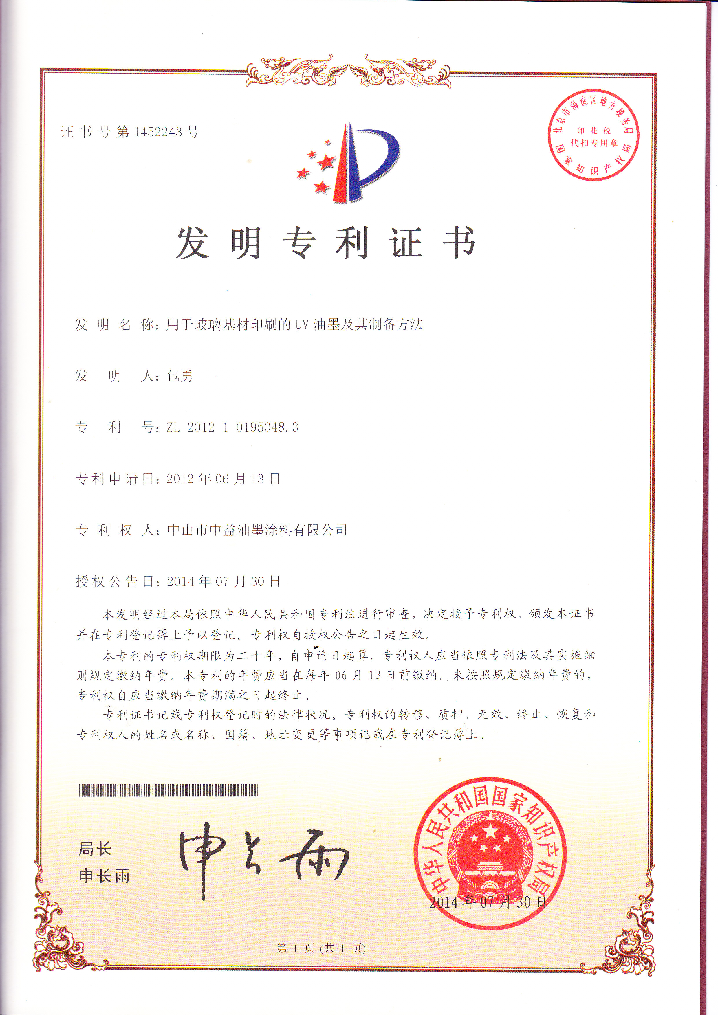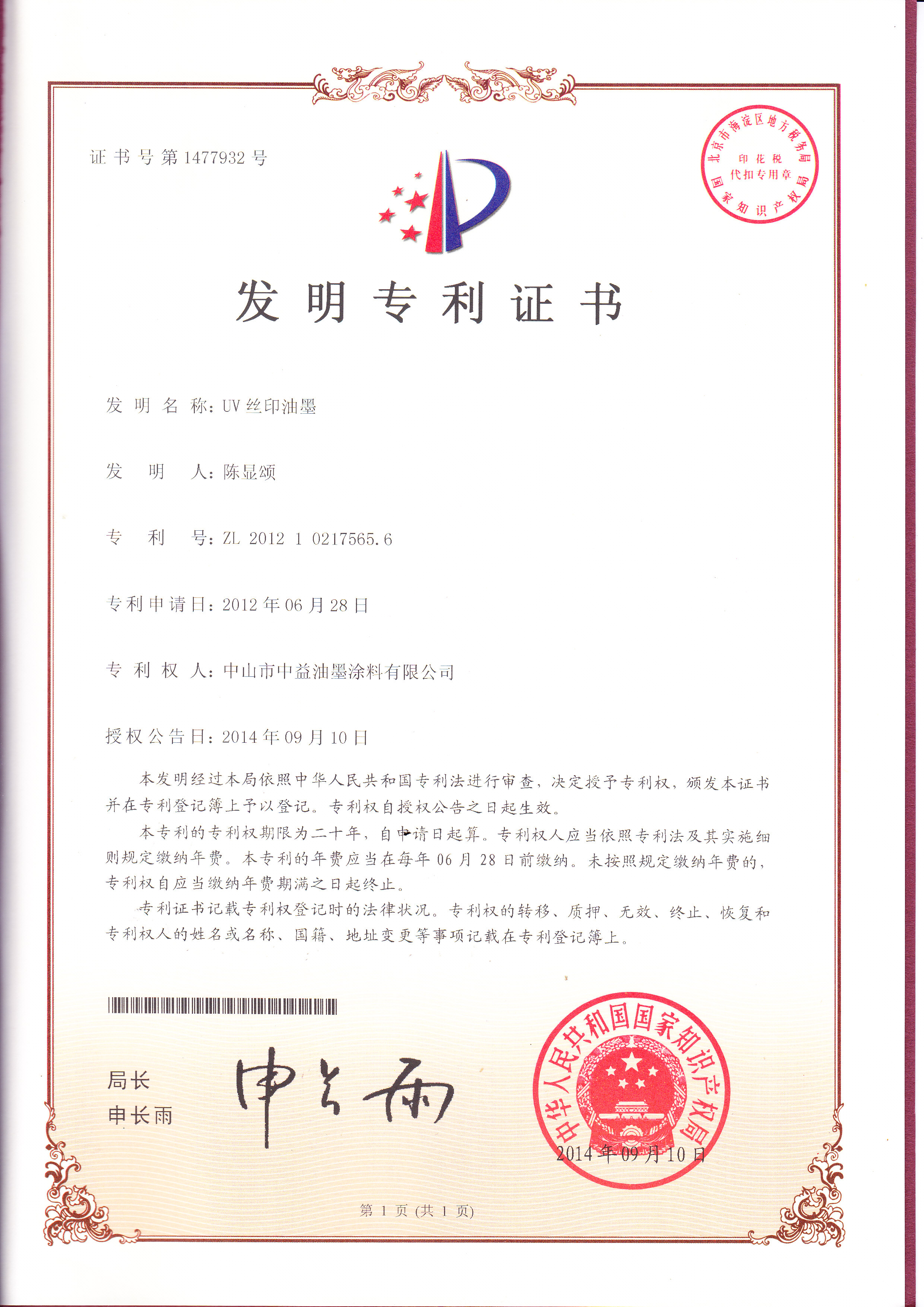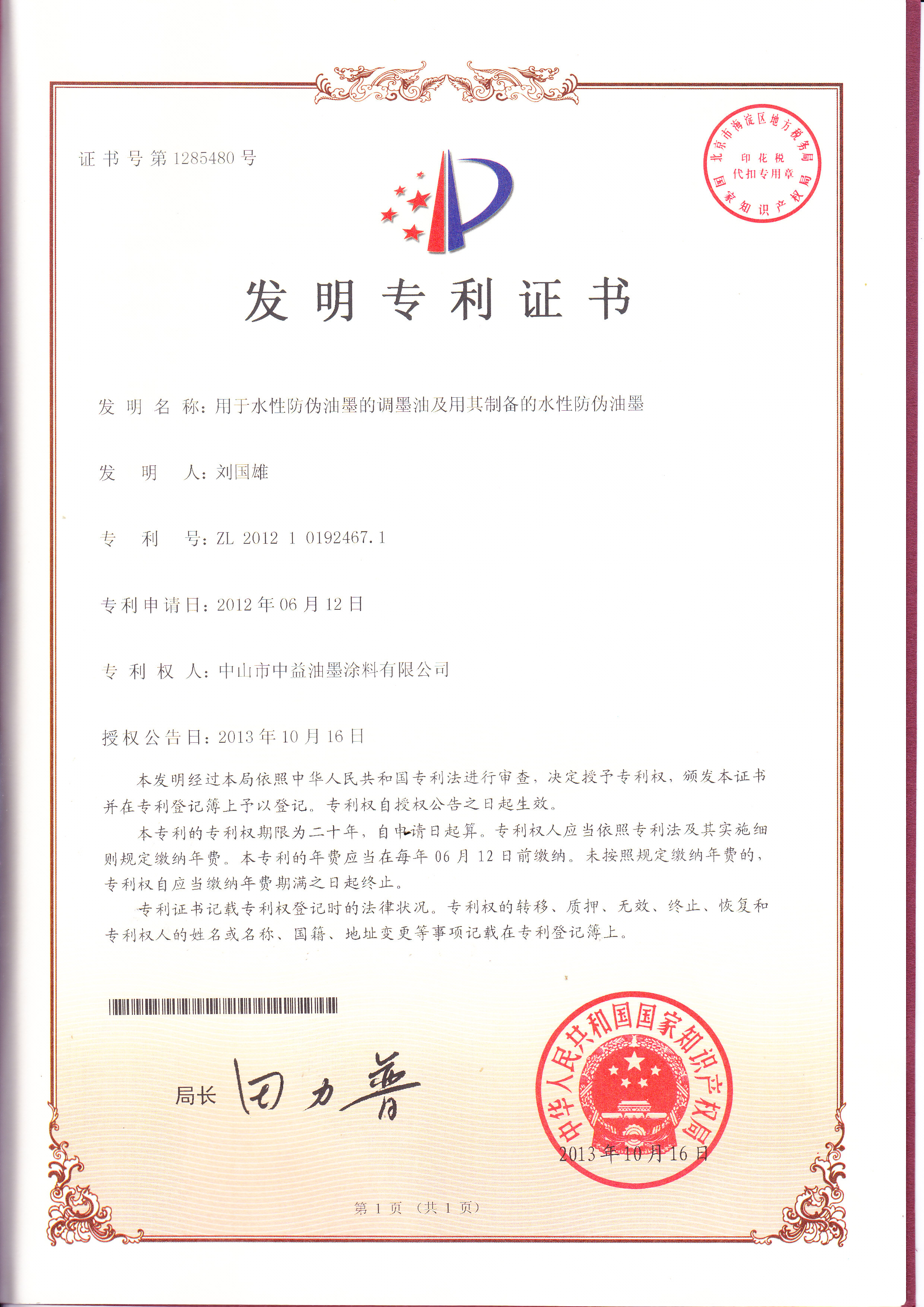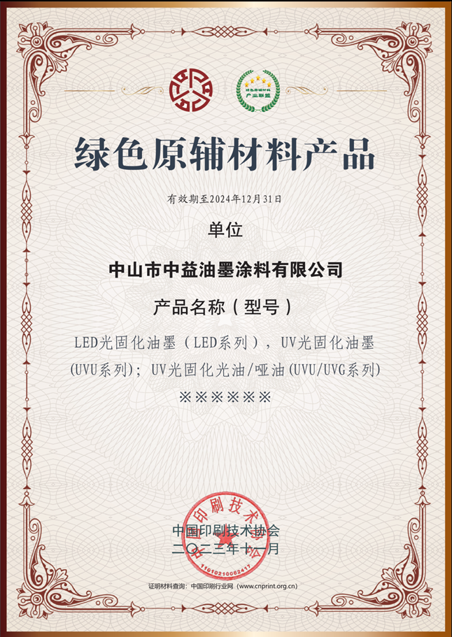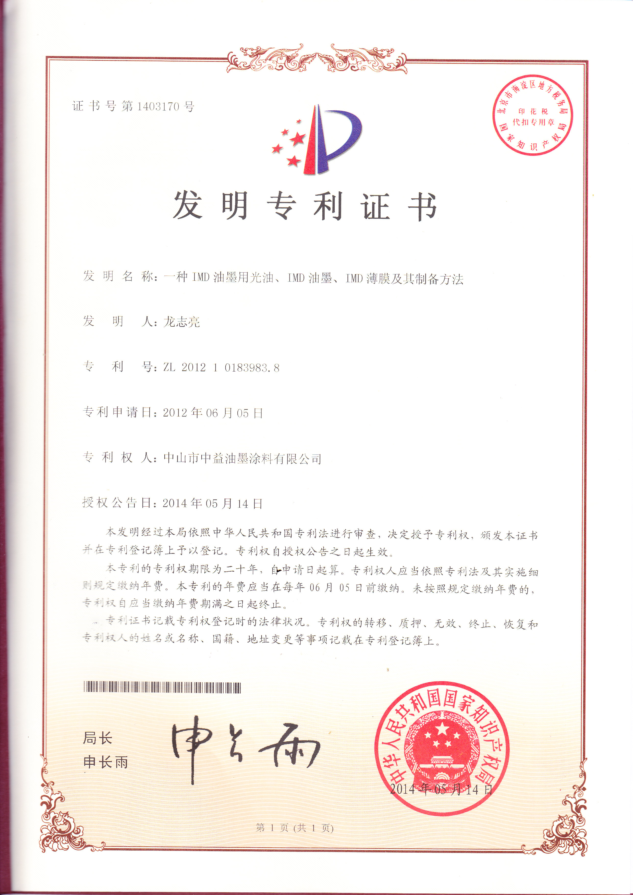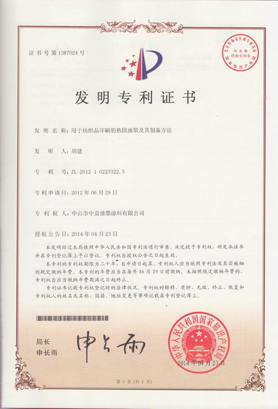 以下是近年来,中益油墨申请到的发明专利证书: