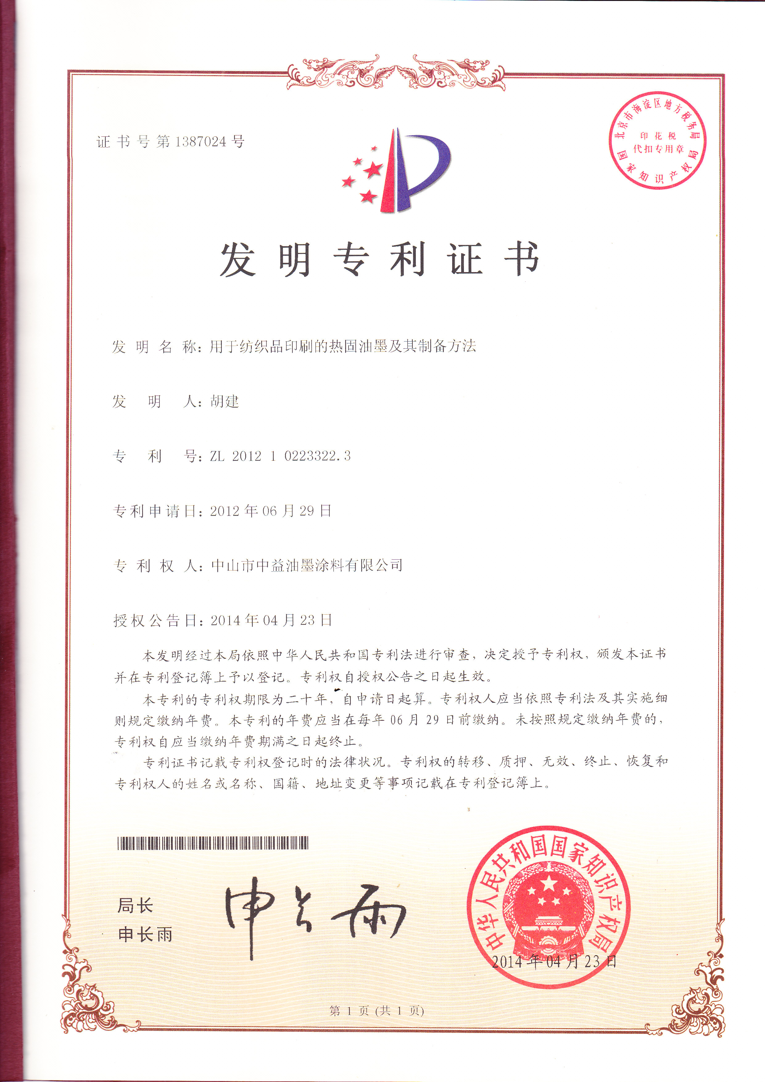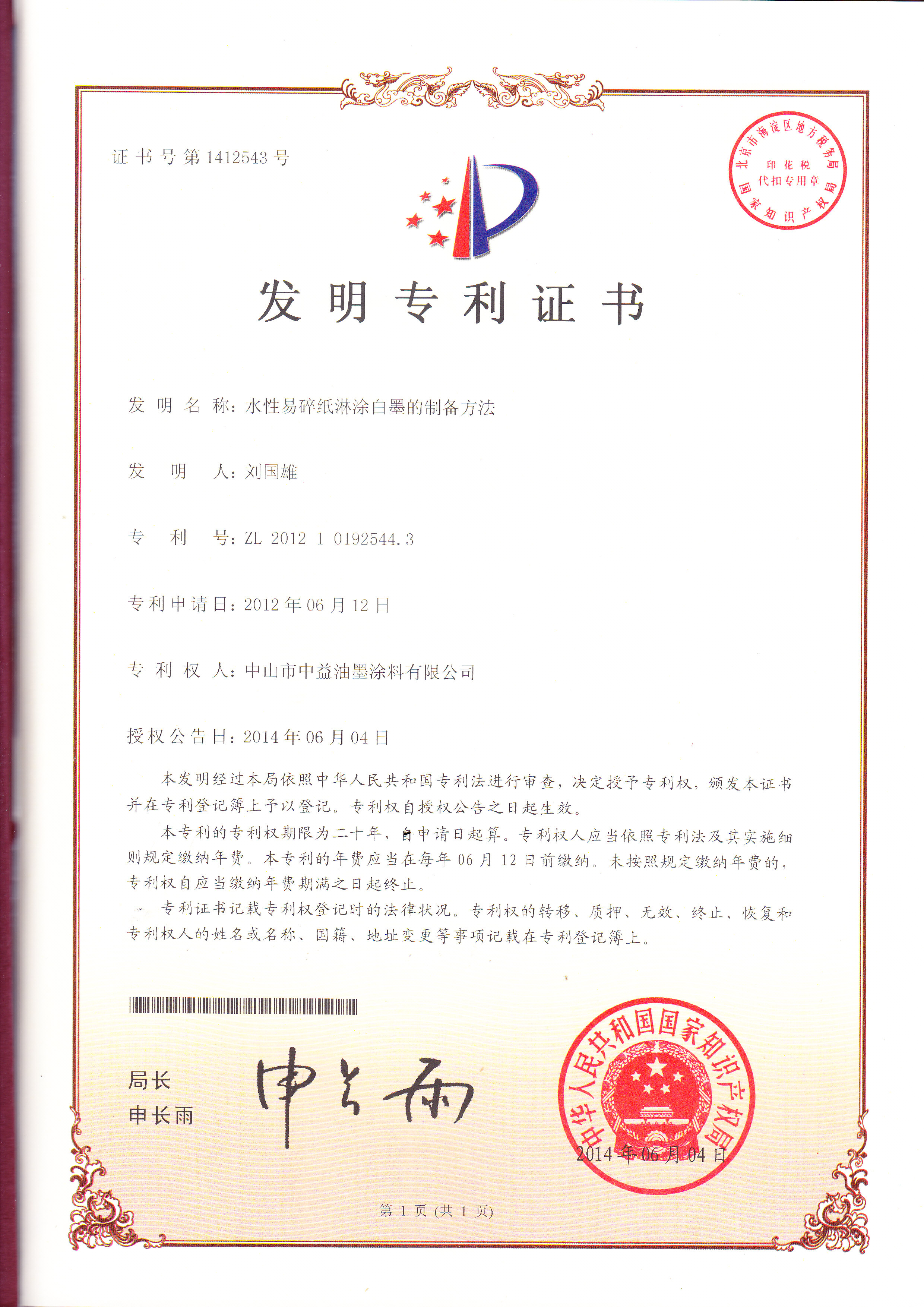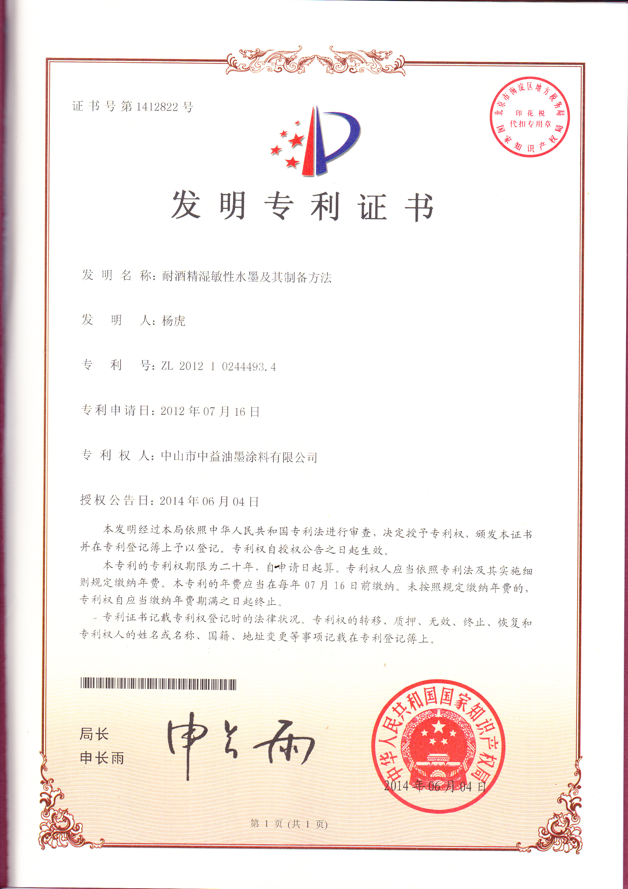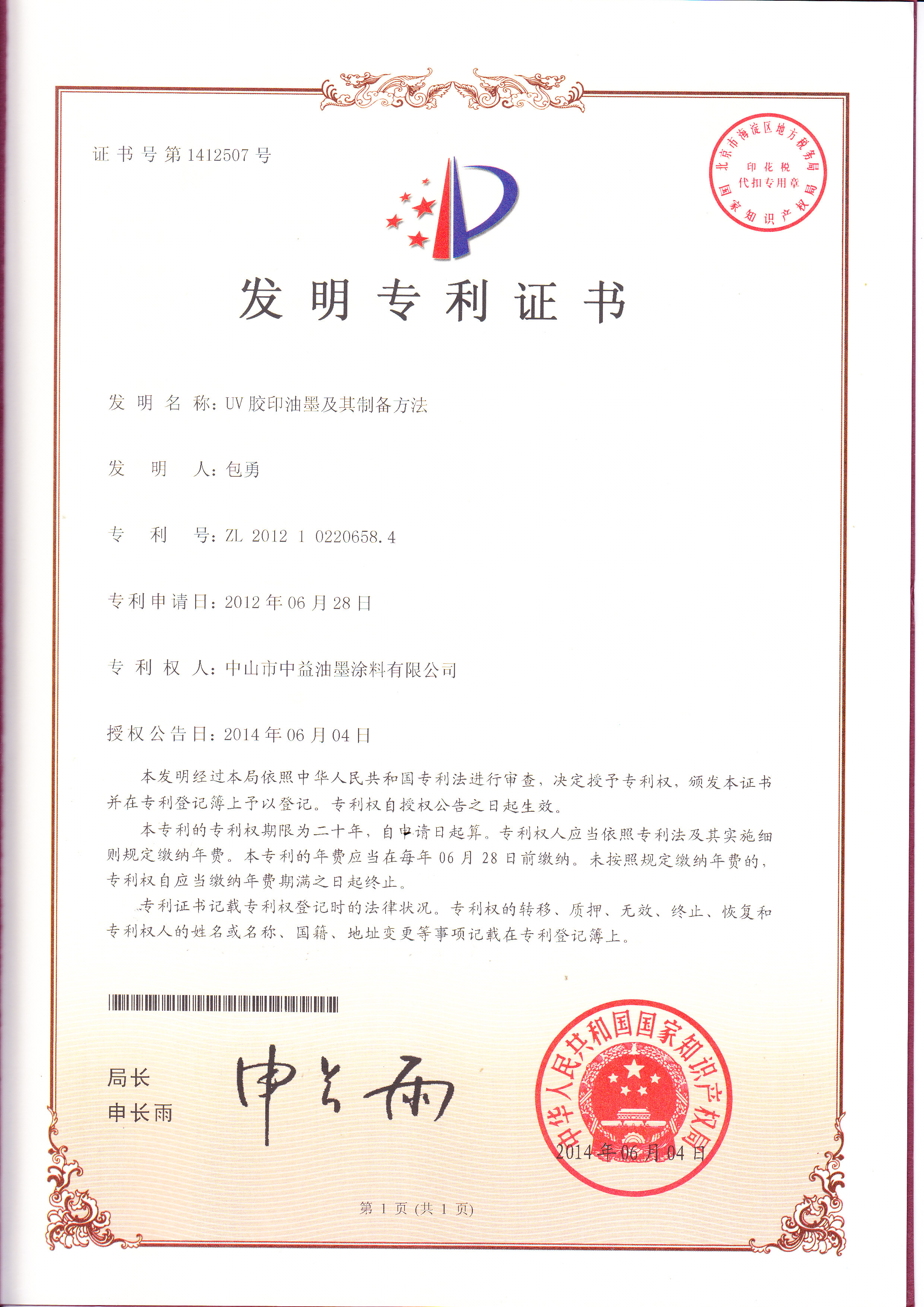 以下是近年来,中益油墨申请到的发明专利证书: